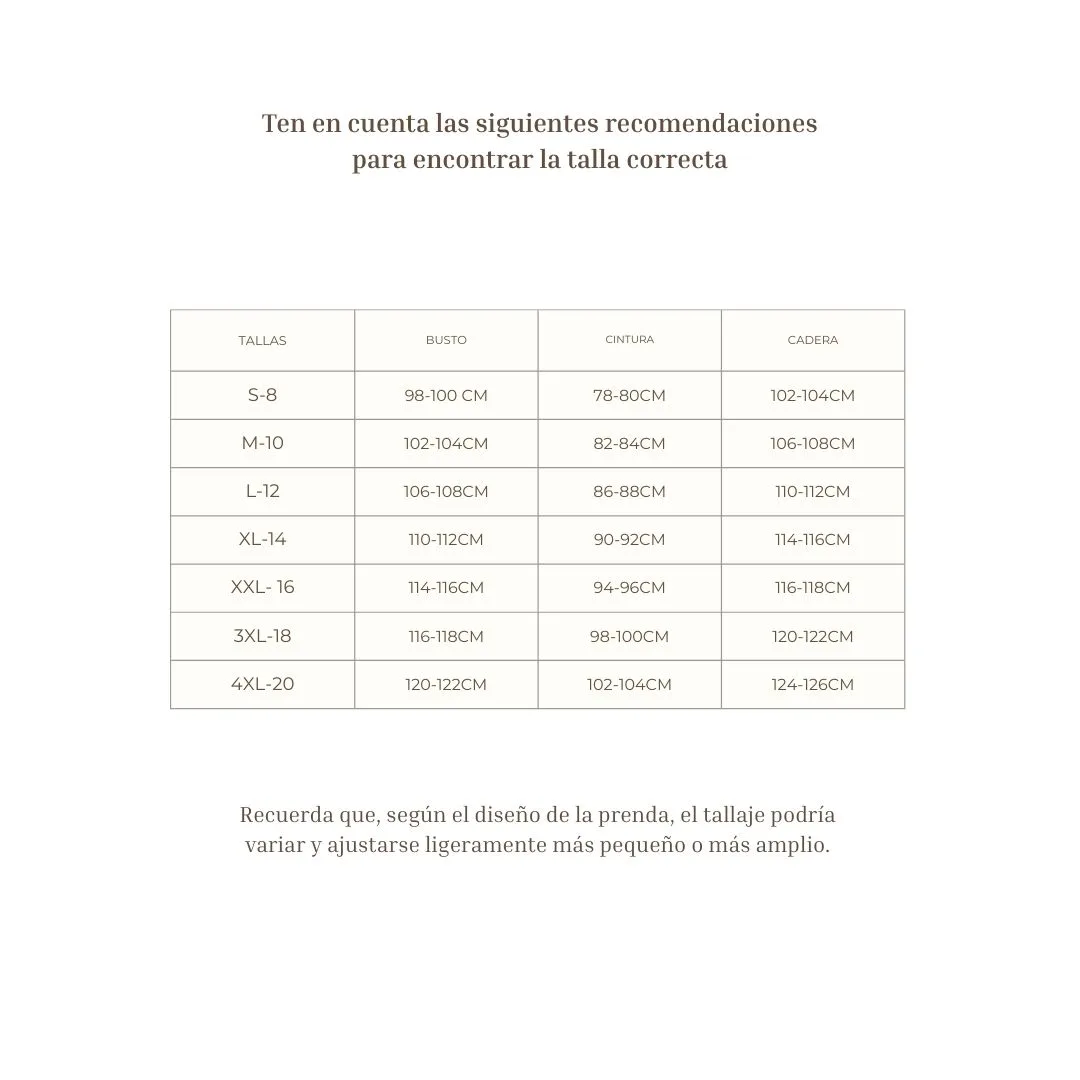 | Talla | 8, 10, 12, 14, 16 |